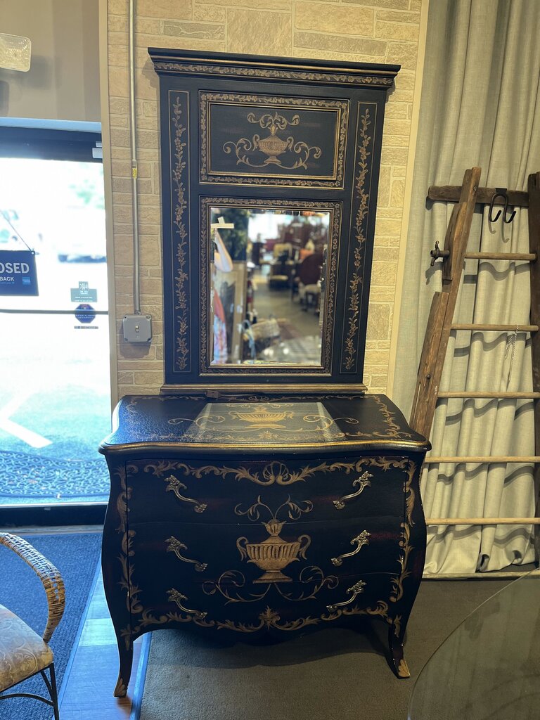 43"W x 37"H x 22.5"D Maitland Smith Grecian Black & Gold Painted 3 Drawer Chest w/ 49"H Mirror from the Kittinger Gallery