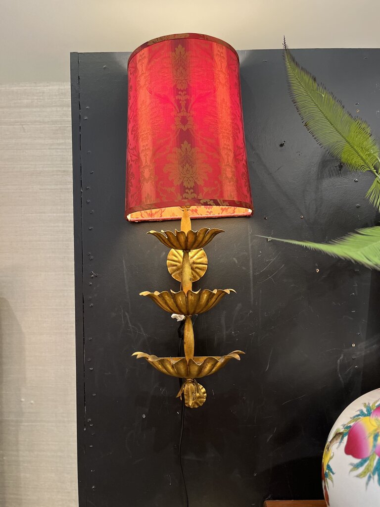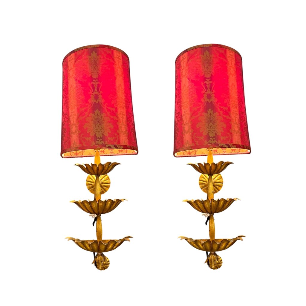 31" PAIR of Italian Gilt Wall Sconces w/ Red Satin Shades Made in Italy